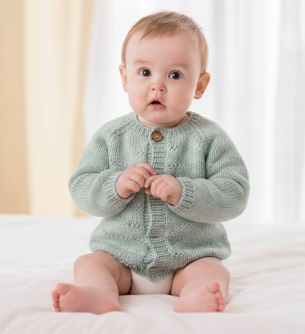 Easy beginner knitted baby cardigan made in eco friendly soft tencel 8ply yarn