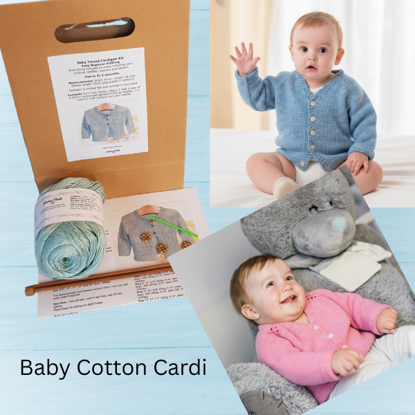 Yarn Club 100% Natural Cotton DK 100g x 1 ball, a 4mm circular knitting needle, 4 x 10mm natural shell buttons, 2 x stitch holders, a sew and yarn needle and thread, knitting pattern in gift box with ribbon.