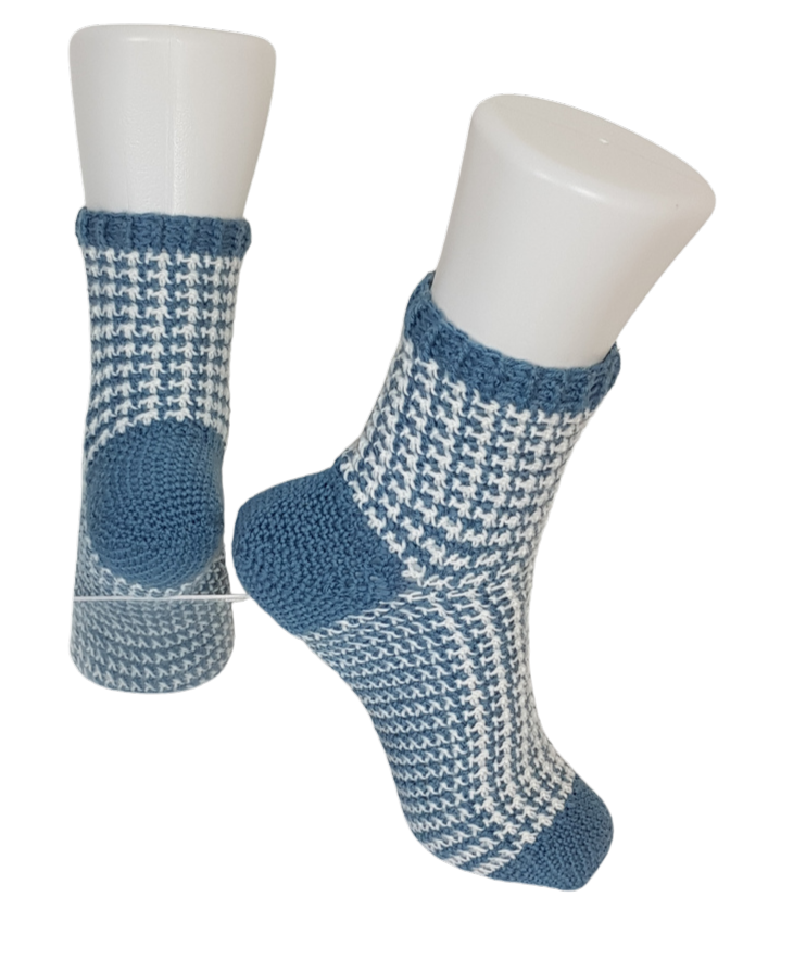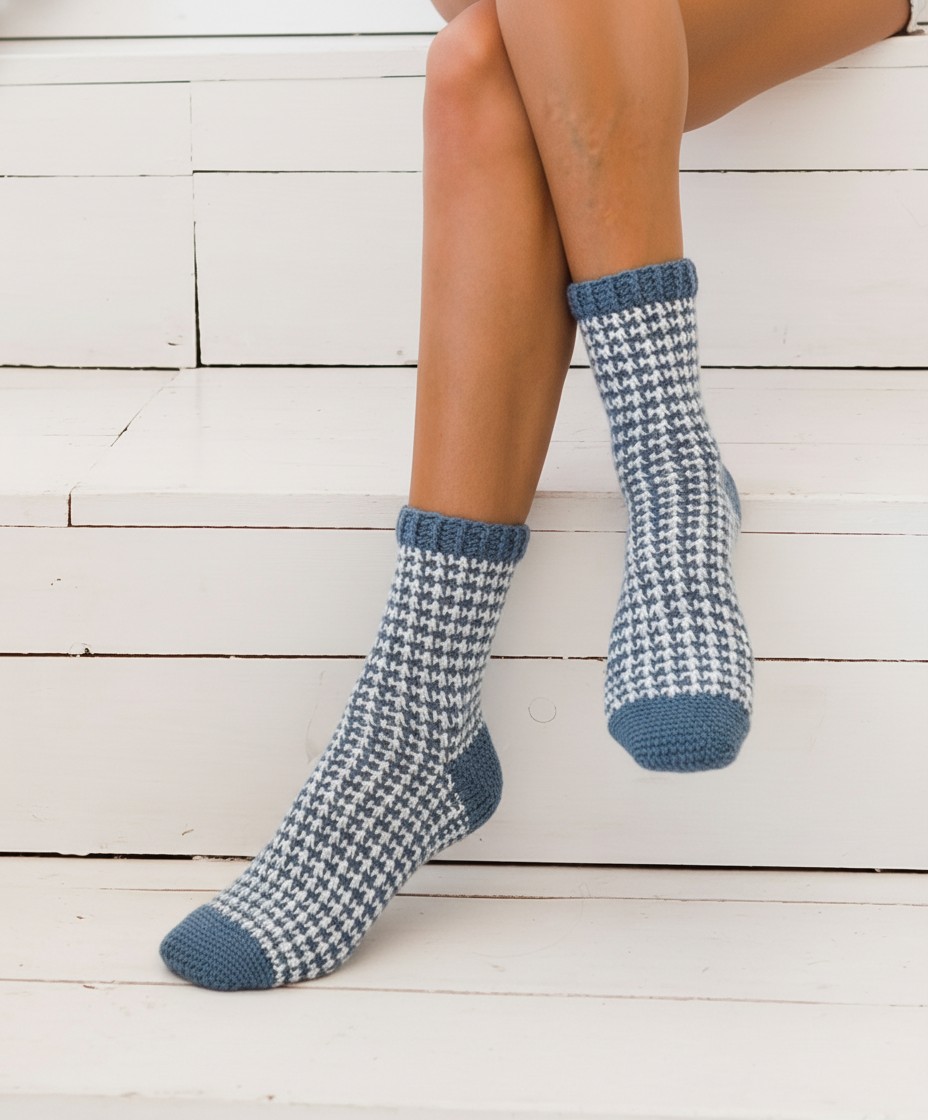 Kit Contents: Plassard Tradi Merino 50g x 2 balls Main Colour (MC) and 1 ball Contrast Colour (C), and digital crochet pattern with option to add printed pattern leaflet and 3mm crochet hook required to make the socks.