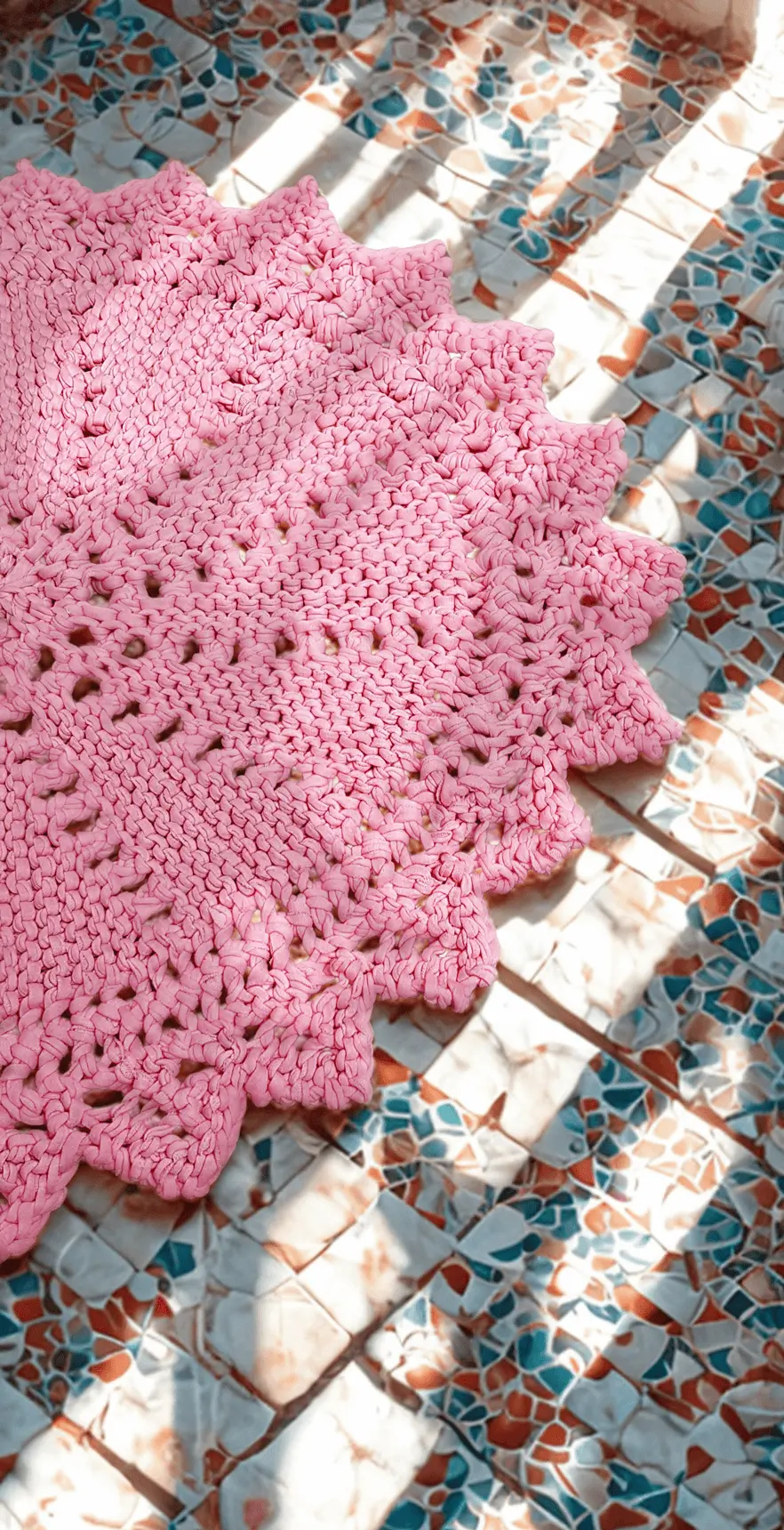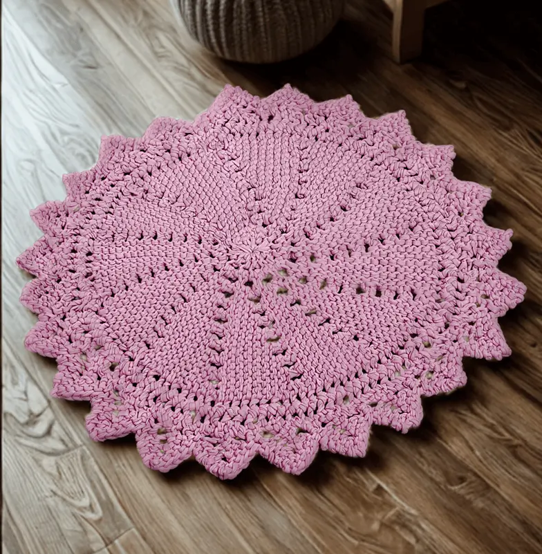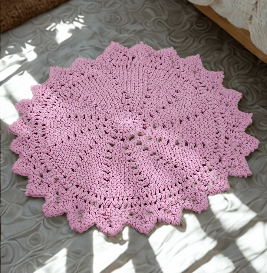 Easy beginner knit floor rug, worked back and forth on straight needles using short rows and seamed at end to form a round rug.