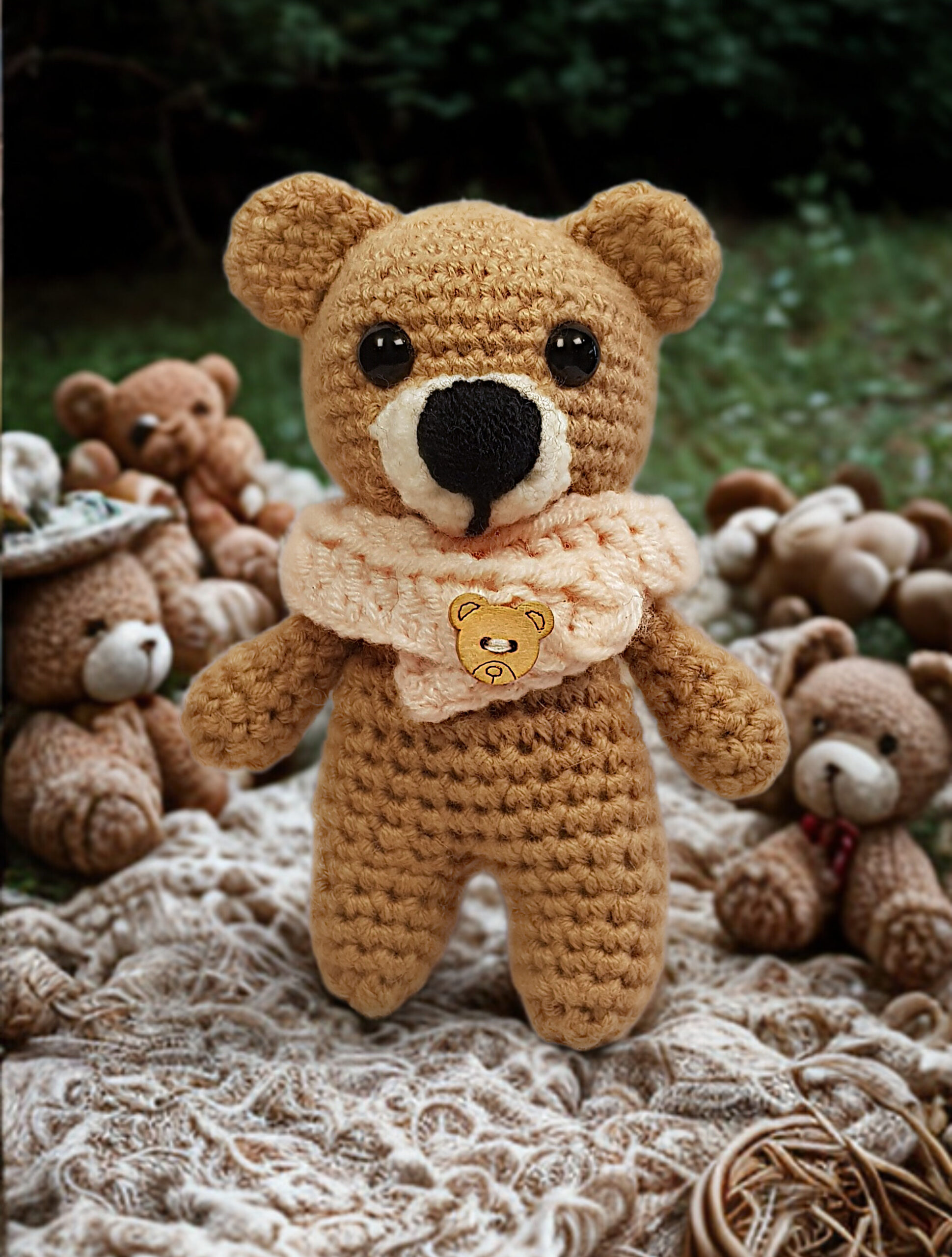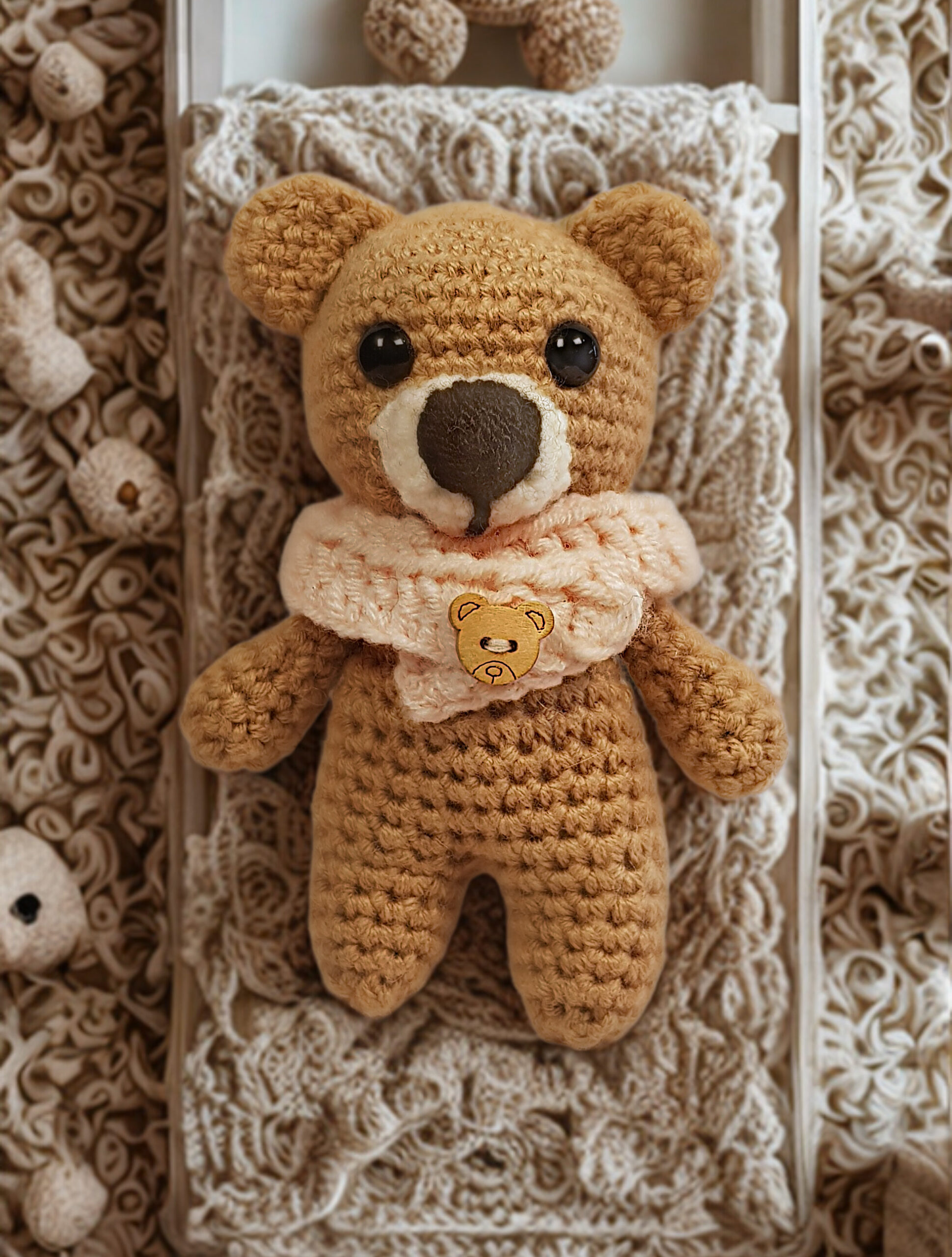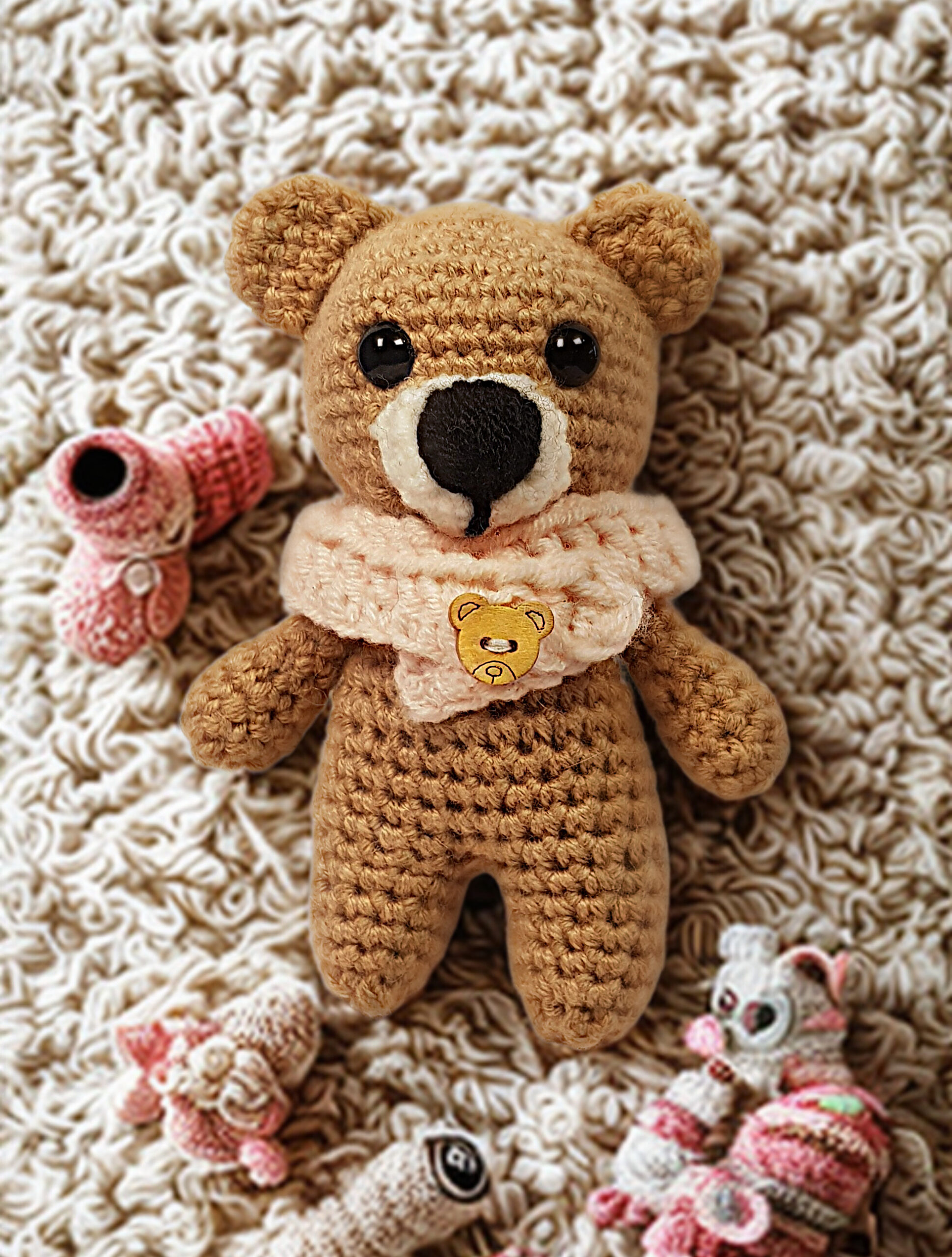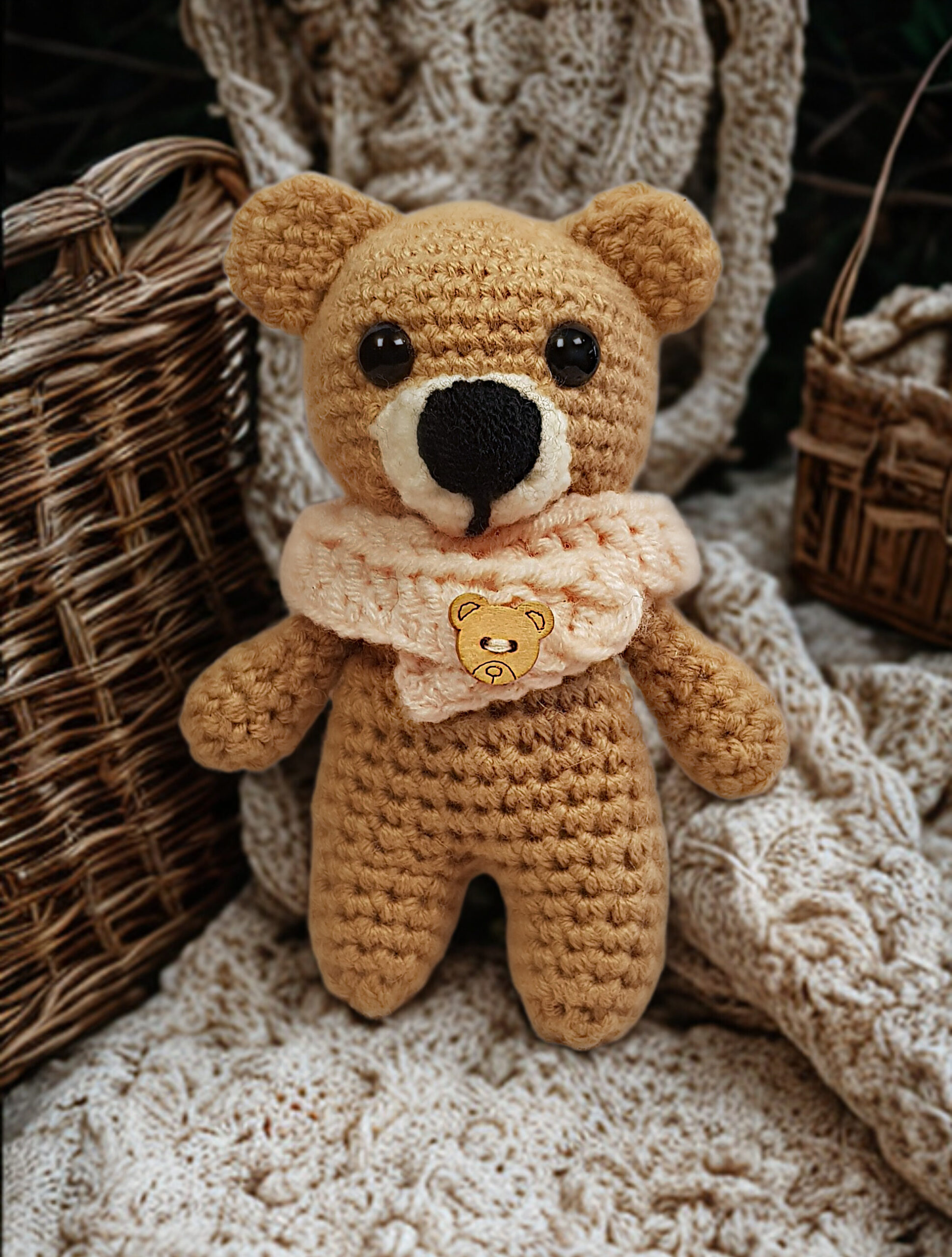 Kit Contents: Yarn Club Poppy 25g, 1 ball Camel, small qty of apricot and cream, a set of 8mm safety eyes, 1 x 10mm teddy button, fiber fill, a 2.5mm crochet hook, 6 x lockable stitch markers, yarn needle and digital crochet pattern with option to add printed pattern leaflet.