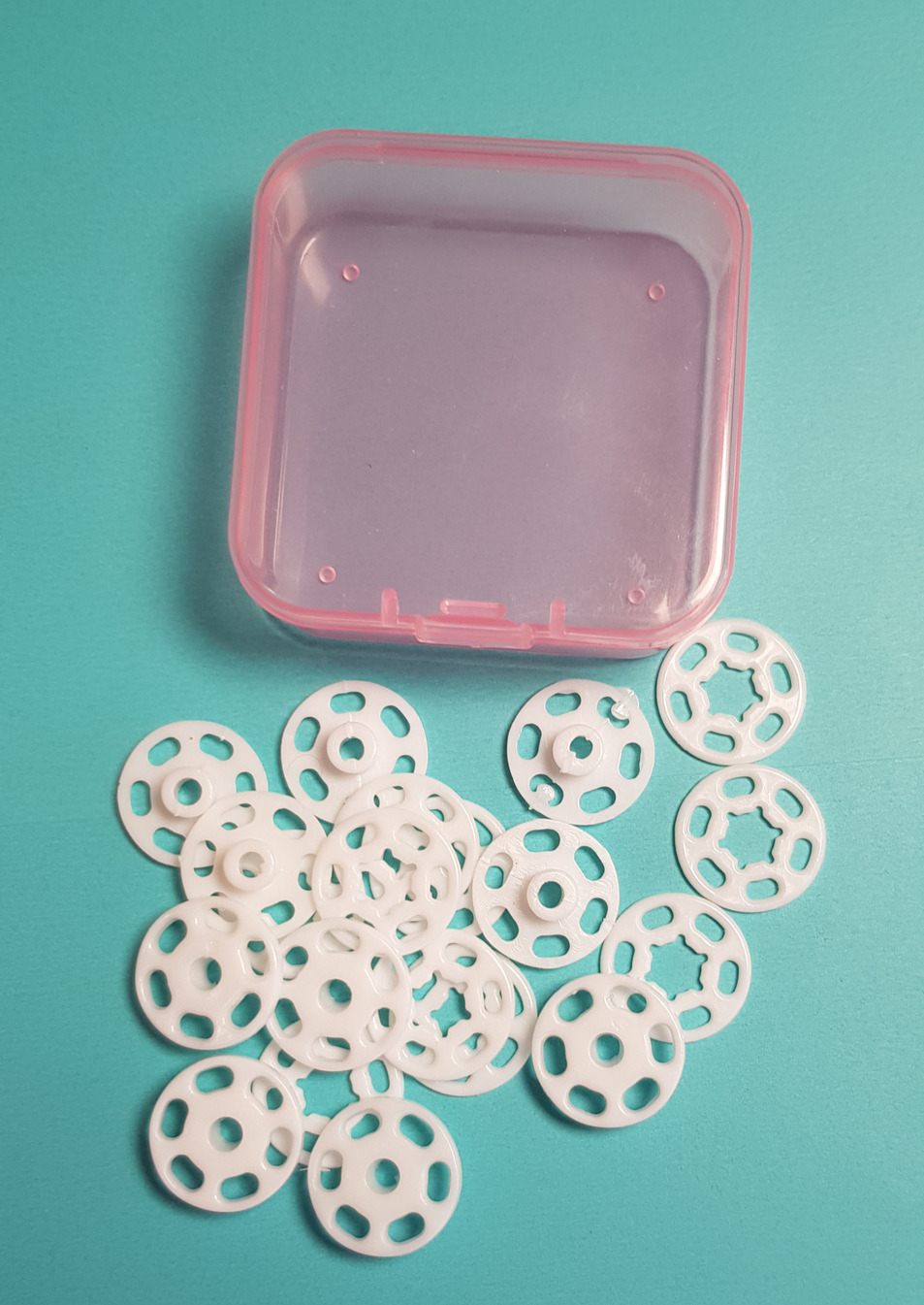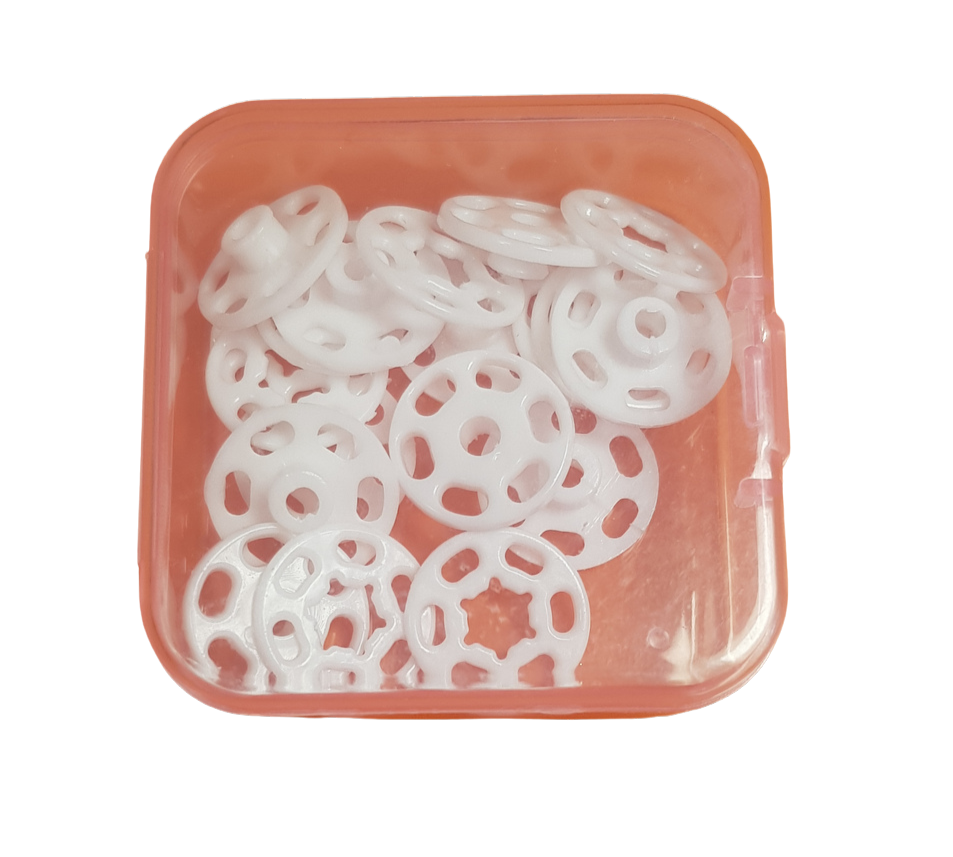 Pack of 10 sew on white snap fasteners in practical storage case